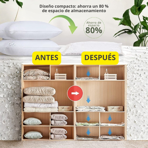 Aprovecha cada rincón de tu hogar con la Bolsa al Vacío. Reduce el volumen de ropa, mantas y textiles en segundos, sin electricidad y sin complicaciones.