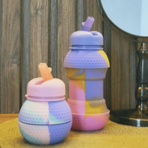 • Material: Silicona de grado alimenticio + tapa de plástico seguro • Capacidad: Hasta 550 ml (expandidas) • Tamaño plegado: Aprox. 9 cm de alto • Colores disponibles: Azul, Rosa, Verde, Gris (sujeto a stock) • Peso ligero: Ideal para actividades deportivas y viajes